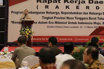 Mataram, Fokus NTb – Wakil Gubernur Nusa Tenggara Barat (NTB) Dr. Hj. Sitti Rohmi Djalilah, M. Pd membuka Rapat Kerja Daerah (Rakerda) Program Pembangunan Keluarga dan Keluarga Berencana (BanggaKencana) Tahun 2020. Rakerda yang digelar oleh Kantor Perwakilan Badan Kependudukan dan Keluarga Berencana Nasional (BKKBN) Provinsi NTB ini diselenggarakan di Hotel Golden Palace, Mataram (11/3/2020).