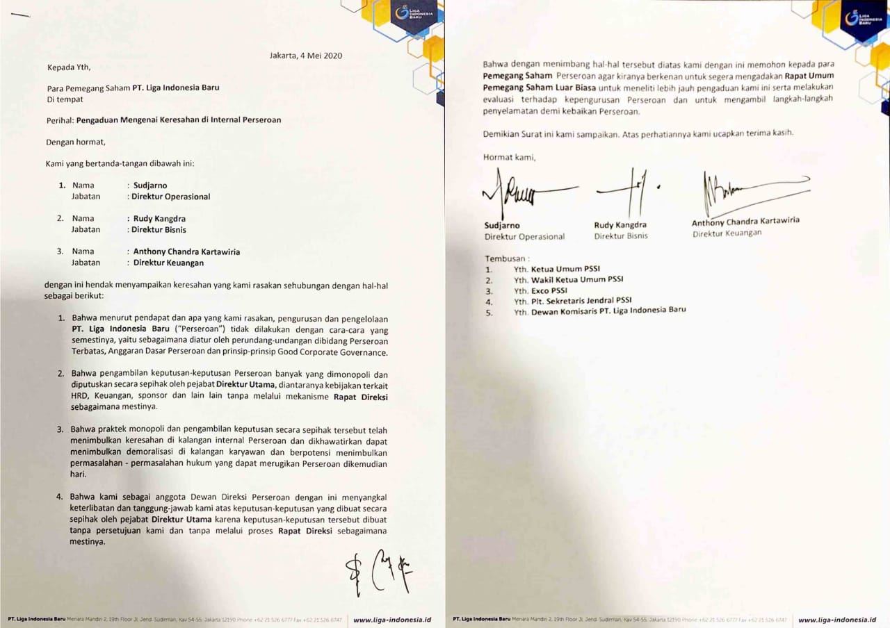 Tiga orang ini kompak menyatakan bahwa pengelolaan PT LIB sebagai sebuah perseroan tidak dilakukan dengan cara-cara yang semestinya sebagaimana diatur oleh perundang-undangan di bidang Perseroan Terbatas, Anggaran Dasar Perseroan dan prinsip-prinsip Good Corporate Governance. (A21)