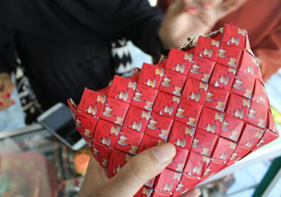 Salah satu konsep yang juga menarik dari Bank Sampah NTB Mandiri untuk dielaborasi adalah seluruh pekerjanya – yang disebut oleh Mbak Aisah sebagai pengrajin sampah – adalah kelompok minoritas difabel. Menurut Mbak Aisah, seiring dengan berjalannya konsep Bank Sampah NTB Mandiri ini, beliau telah bisa membangun kepercayaan kepada salah satu anggotanya untuk berbagi peran dalam pengelolaan Bank Sampah NTB Mandiri. “Ini namanya Mbak Femi, dia tangan kanan saya, kalau saya ada urusan di luar negeri atau luar kota, Bank Sampah saya serahkan sama dia, saya mah percaya aja dah”, dengan riang Mbak Aisah memperkenalkan salah satu staf kepercayaan beliau yang bernama Femi. Dengan keterampilan bak sales marketing ternama, Mbak Femi mulai mengajak kami untuk berkeliling ke masing-masing outlet Bank Sampah NTB Mandiri dan menjelaskan satu persatu barang dagangan yang ada di sana. Mulai dari dompet dari sampah, ikat pinggang dari ban bekas, tikar dari bungkus kopi, gantungan kunci dari berbagai barang bekas, sumpit dan sedotan dari kertas bekas dan berbagai pernak-pernik dari sampah lainnya. “Pengrajin yang bekerja di Bank Sampah NTB Mandiri saat ini baru 9 (sembilan) orang dan semuanya difabel, padahal selama 9 tahun saya sudah ngajar +/-2000 orang, sekali ngajar bisa sampai 100 orang, tapi yang berstandar sesuai SOP Bank Sampah baru 5 orang”. “Banyak orang yang sudah belajar dan ikut pelatihan, tapi baru buat kerajinan dari sampah satu dua kali sudah bosan, karena mereka hitungnya hanya bijian, bukan dihitung berapa kali banyaknya”. “Per biji langsung mau dihargai tinggi, kalo Rp. 1000 ga mau, padahal kalo dikalinya 100 biji kan dapat Rp. 100 ribu, tapi mereka tidak mau, nah ini yang masih jadi kendala untuk mendapatkan pengrajin yang terstandar sesuai dengan SOP di Bank Sampah”, demikian penjelasan Mbak Aisah menyikapi minimnya SDM yang mau berwirausaha secara serius dalam konsep pengolahan sampah seperti yang selama ini telah ditekuni oleh Mbak Aisah Odist bersama Bank Sampah NTB Mandiri-nya.