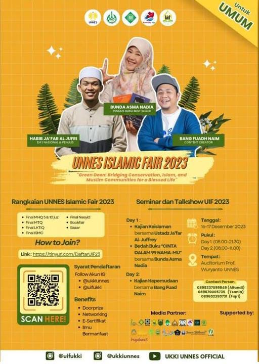 Event UNNES Islamic Fair merupakan kegiatan tahunan yang terdiri dari lomba dan seminar. Adapun kategori lomba yang diselenggarakan yaitu : Tilawah, nasyid, Islamic Short Movie, Karya tulis ilmiah Al-Qur;an, dan hifdzil qur’an kategori 5 juz dan 10 juz. Seminar pada kegiatan UNNES Islamic Fair 2023 mendatangkan narasumber tokoh penulis nasional yaitu Asma Nadia, pemuka agama Habib Ja’far Al Jufri, dan Content creator Fuadh Naim. Seminar diselenggarakan di Auditorium Prof. Wuryanto UNNES.