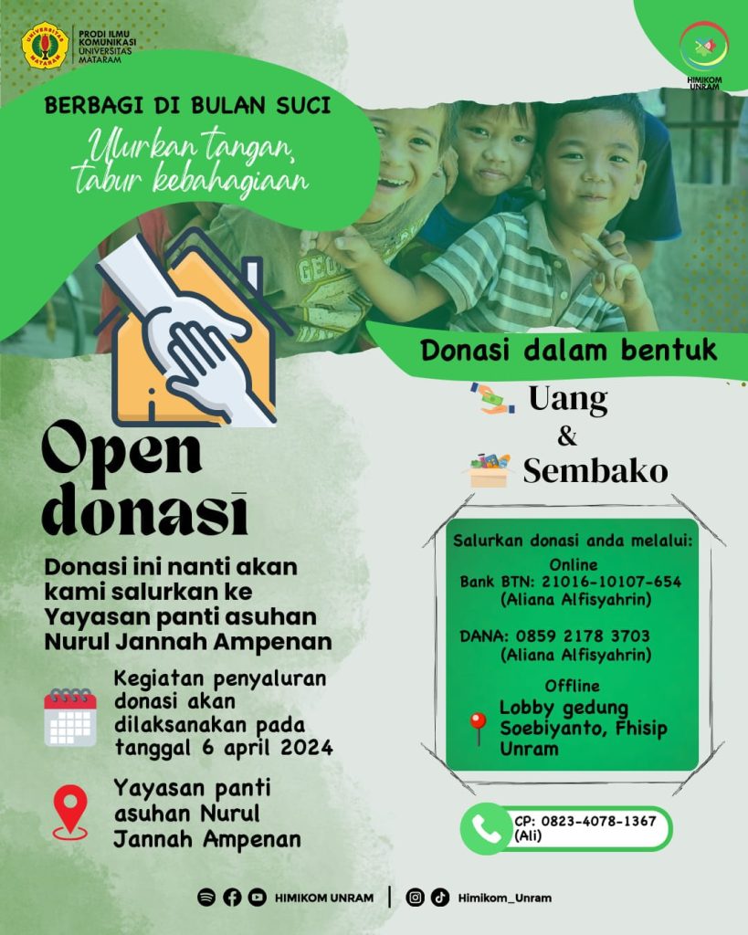 Himikom Unram lagi ngadain open donasi nih ☺️. Nantinya donasi ini akan disalurkan ke Panti Asuhan Nurul Jannah Ampenan, Mataram. Donasi berupa bantuan uang & sembako.