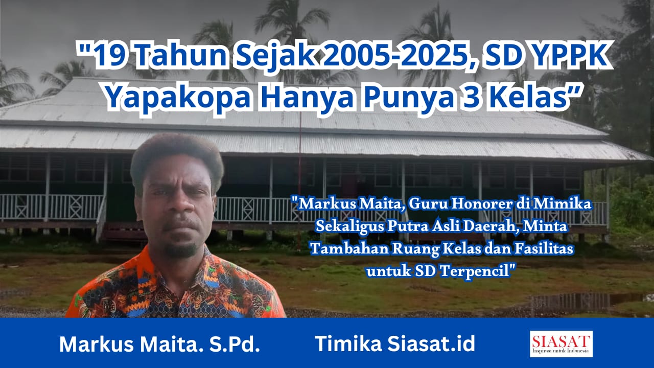 Papua Tengah. Siasat ID – Markus Maita, S.Pd., seorang guru honorer sekaligus putra asli daerah Kabupaten Mimika, menyampaikan permohonan resmi kepada Pemerintah Daerah dan Dinas Pendidikan setempat untuk segera melakukan penambahan sarana prasarana pendidikan di SD YPPK Yapakopa, Distrik Mimika Barat Jauh. Permintaan ini didasari oleh kondisi sekolah yang hanya memiliki tiga ruang kelas sejak dibangun pada 2005, padahal kebutuhan akan ruang belajar, meja, kursi, perumahan guru, serta tenaga pendidik sangat mendesak.