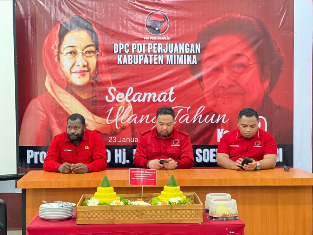 Timika, 23 Januari 2026 – DPC PDI Perjuangan Kabupaten Mimika memperingati Hari Ulang Tahun (HUT) ke-79 Ketua Umum partai, Megawati Soekarnoputri, dengan acara syukur dan refleksi perjuangan. Kegiatan yang berlangsung di Sekretariat DPC setempat ini diwarnai pemotongan tumpeng sebagai simbol rasa terima kasih dan penghormatan atas kepemimpinan serta dedikasi Megawati dalam membesarkan partai.