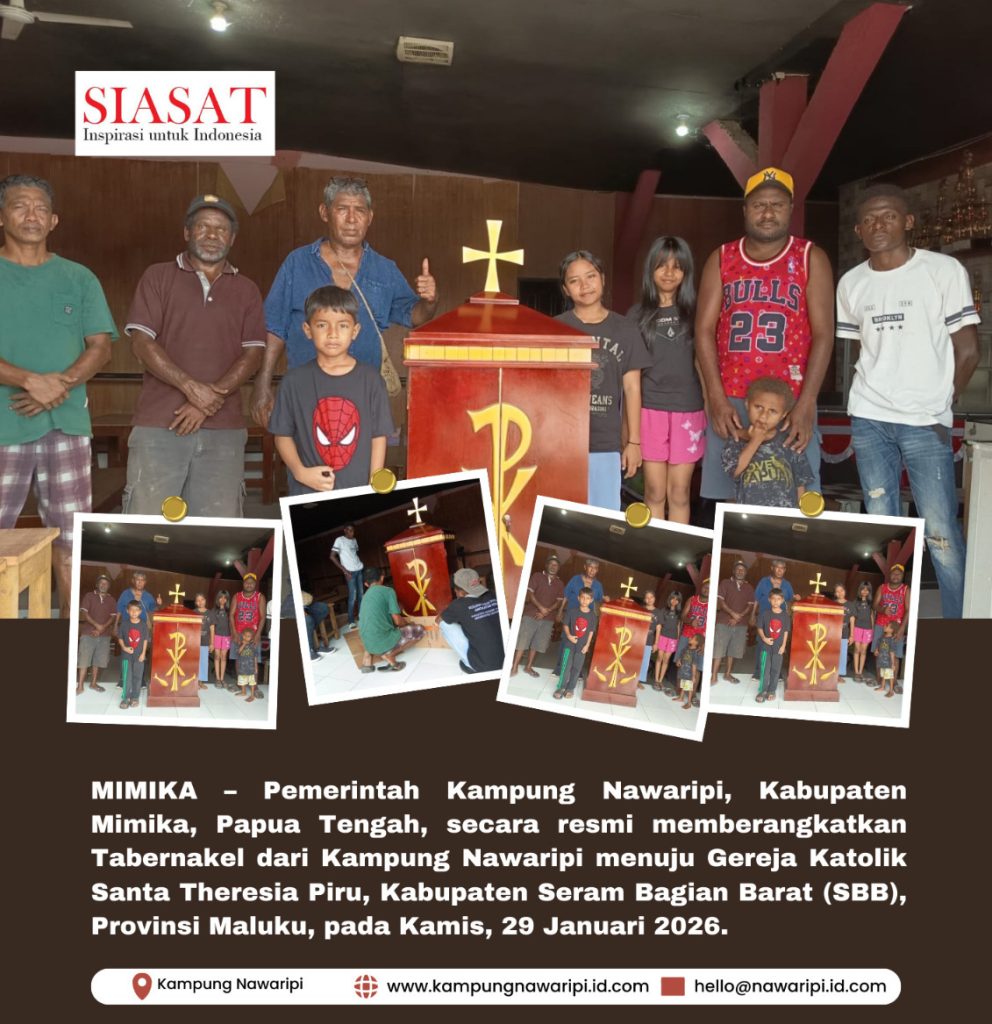MIMIKA – Pemerintah Kampung Nawaripi, Kabupaten Mimika, Provinsi Papua Tengah, secara resmi memberangkatkan Tabernakel karya Balai Latihan Kerja (BLK) Kampung Nawaripi menuju Gereja Katolik Santa Theresia Piru, Kabupaten Seram Bagian Barat, Provinsi Maluku, pada Kamis, 29 Januari 2026.