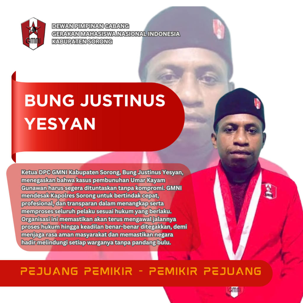 Kabupaten Sorong, 18 Februari 2026 – Ketua Dewan Pimpinan Cabang (DPC) Gerakan Mahasiswa Nasional Indonesia (GMNI) Kabupaten Sorong, Bung Justinus Yesyan, secara tegas mendesak Kapolres Sorong agar segera menangkap dan memproses hukum tujuh pelaku pembunuhan terhadap Umar Kayam Gunawan.