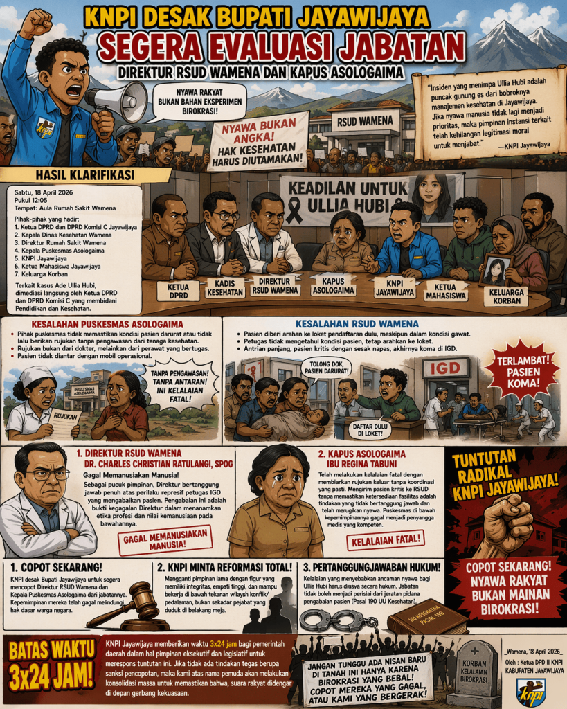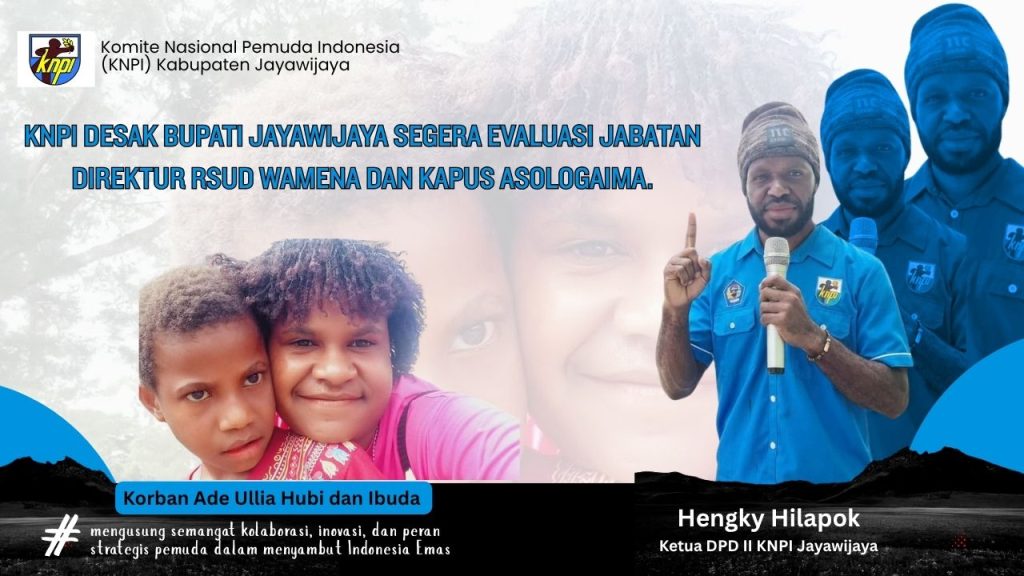 Demi memulihkan kepercayaan publik dan menjamin keselamatan rakyat di 8 Kabupaten Papua Pegunungan, KNPI Jayawijaya desak kepada Bupati Jayawijaya untuk segera mencopot Direktur RSUD Wamena dan Kepala Puskesmas Asologaima dari jabatannya. Kepemimpinan mereka telah gagal melindungi hak dasar warga negara.