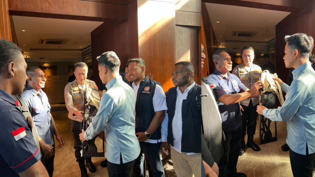 Timika, 22 April 2026 — Ketua Karang Taruna Kabupaten Mimika, Vinsensius Apoka, menyerahkan noken dan suvenir patung khas daerah kepada Wakil Presiden Republik Indonesia, Gibran Rakabuming Raka, dalam rangka kunjungan kerja di Kabupaten Mimika, Papua Tengah, Selasa (21/4).