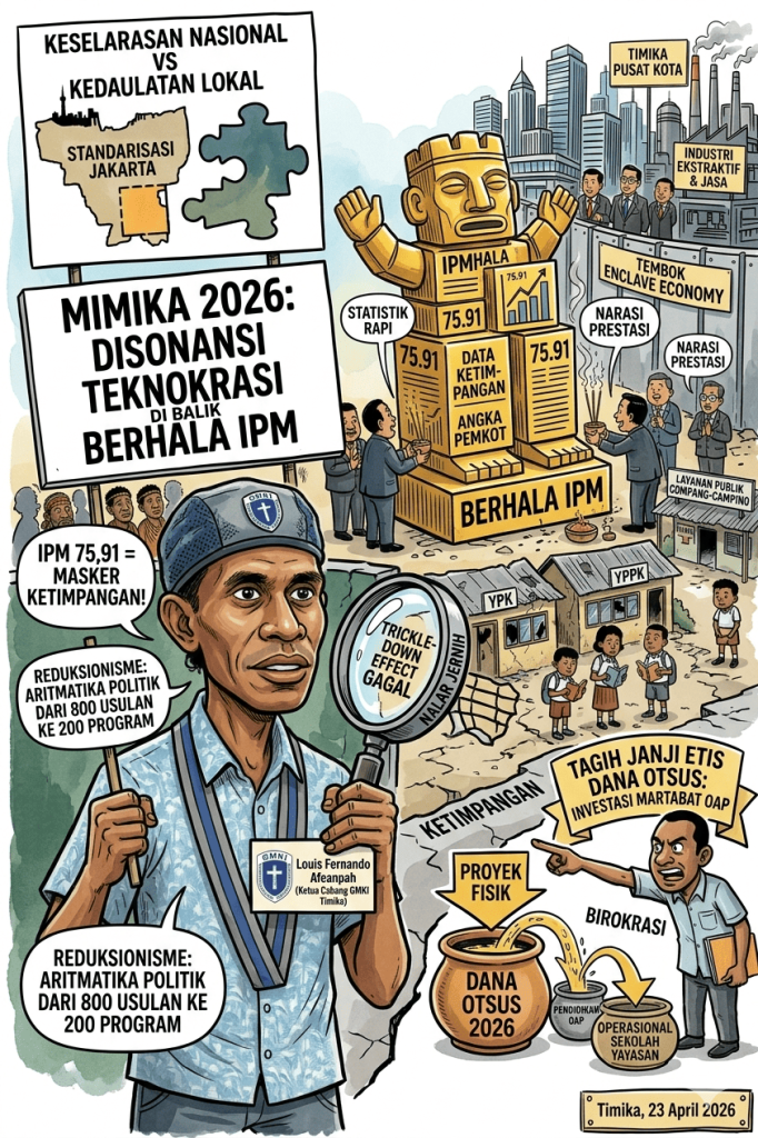 Mimika | Rencana pembangunan Mimika tahun 2026 yang dipaparkan Bappeda menyuguhkan narasi prestasi yang memukau: Indeks Pembangunan Manusia (IPM) mencapai angka 75,91, tertinggi di Papua Tengah. Namun, dalam kacamata nalar yang jernih, angka ini justru memicu pertanyaan eksistensial: Apakah angka tersebut mencerminkan kualitas hidup manusia secara inklusif, atau sekadar keberhasilan birokrasi dalam merapikan statistik di tengah ketimpangan yang menganga?