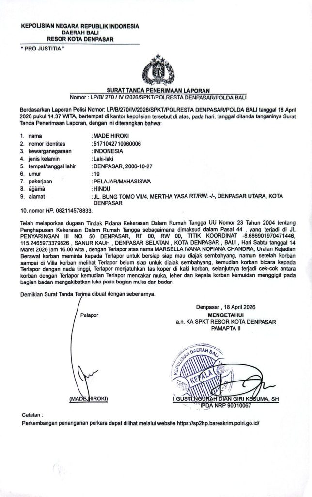 Ia mengaku telah membuat laporan polisi secara resmi di Polresta Denpasar terhadap terlapor atas dugaan KDRT. Laporan tersebut, menurutnya, dibuat agar proses hukum berjalan sesuai aturan. “Saya minta jangan ada oknum pejabat daerah yang menghambat atau menghalangi proses pidana KDRT ini. Publik melihat ada keberpihakan oknum tersebut kepada pihak Marsella,” ujarnya.